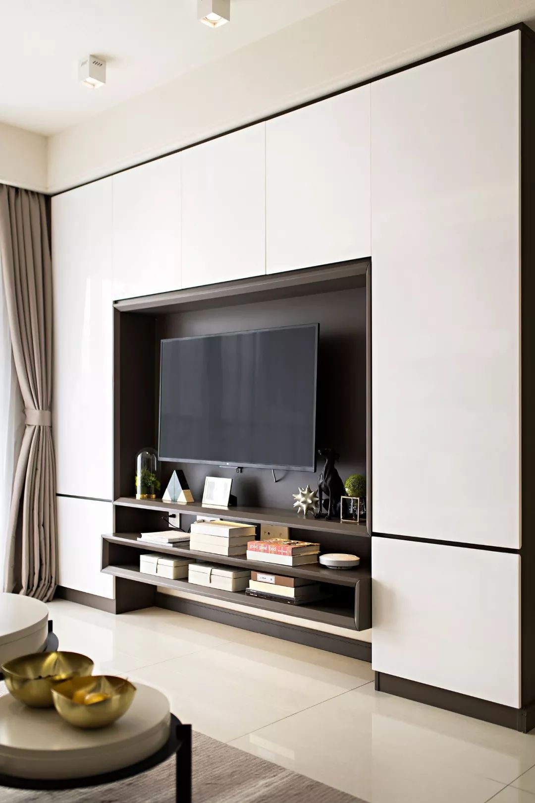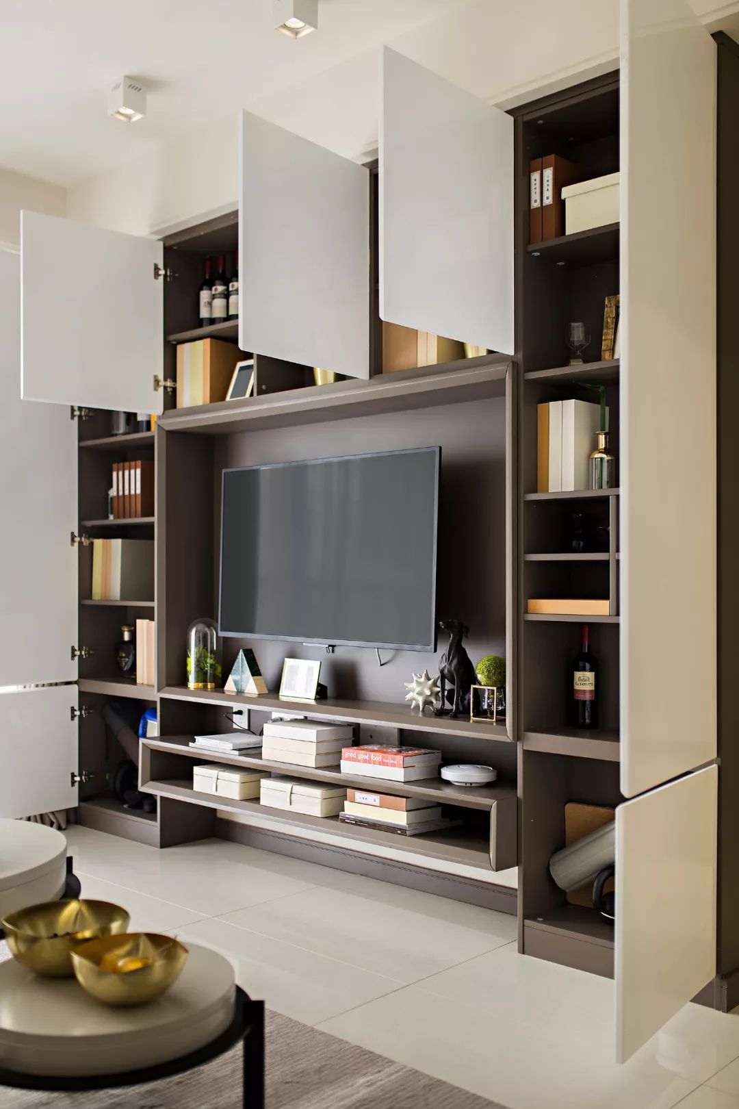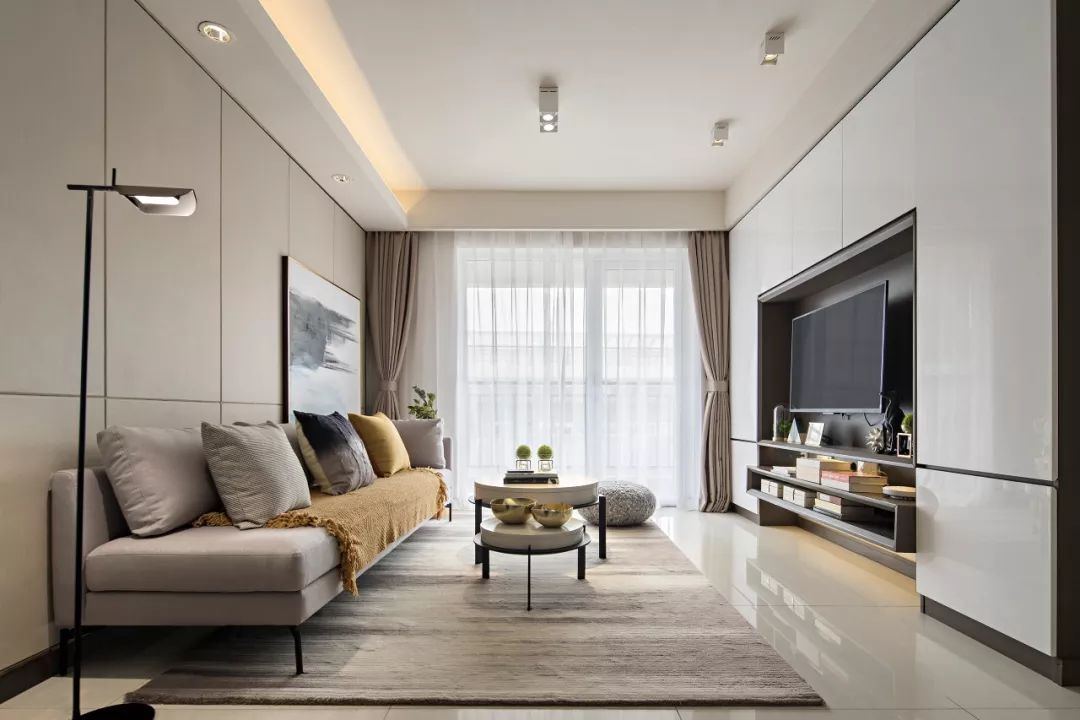 客厅电视墙,震撼的收纳体量,让堆积如山的杂物不复存在。墙柜集齐了客厅的娱乐功能和收纳功能!