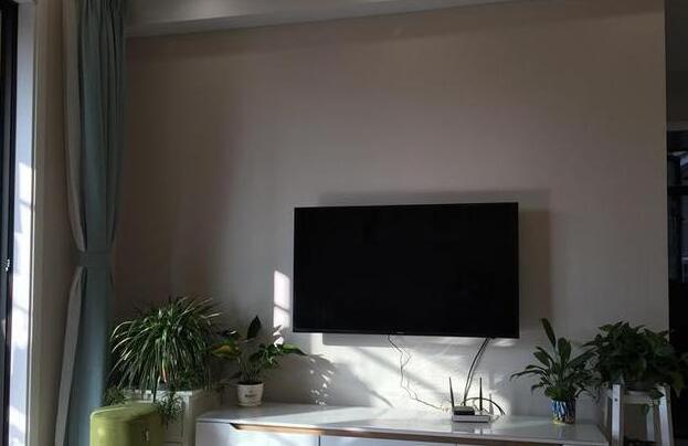 电视背景墙虽然简单但是是用的卡颂涂料,做了暖黄色的效果,同时以绿色植物为背景显得绿意盎然,多了一股活力。