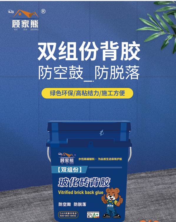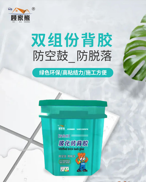 双组份背胶:改善界面,双重保障,滚涂施工,高效便捷,超强粘结,耐水耐温,净味配方,绿色环保顾家熊双组份玻化砖背胶,桶内配置有固定比例的粉料和液料。使用时,只需将桶内液料和粉料按比例进行混合,便可用于玻化砖背涂处理,批刮后可直接使用瓷砖胶进行铺贴,可有效解决低吸水率砖易出现的空鼓、脱落等问题。适用范围:适用于不同吸水率瓷砖背面界面处理,可有效改善瓷砖背面界面情况使用方法:需要按比例进行电动搅拌均匀后,批刮到砖背使用,推荐搭配顾家熊瓷砖胶贴砖。具体分以下步骤:第一步,彻底清除砖背的灰尘、油污、脱模剂等。第二步,将桶内液料和粉料按照比例进行混合,用电动搅拌机进行充分搅拌,静止2-3分钟后,再次充分搅拌,即可使用。中间不能加入水泥、砂子、水等物质。第三步,用灰刀薄薄将背胶批刮到砖背,厚度大约1毫米即可,不需要等待干固。第四步,搭配使用顾家熊瓷砖胶进行薄贴瓷砖。瓷砖背胶出现“缩聚”,你该如何应对?瓷砖背胶涂刷于瓷砖背面,有效提高瓷砖与粘结材料之间的粘结强度,解决瓷砖湿贴中常见的空鼓、脱落问题。因此,许多家里装修贴瓷砖都是选用瓷砖背胶。但是,有些师傅涂刷完背胶之后出现缩聚现象,查找不到原因。