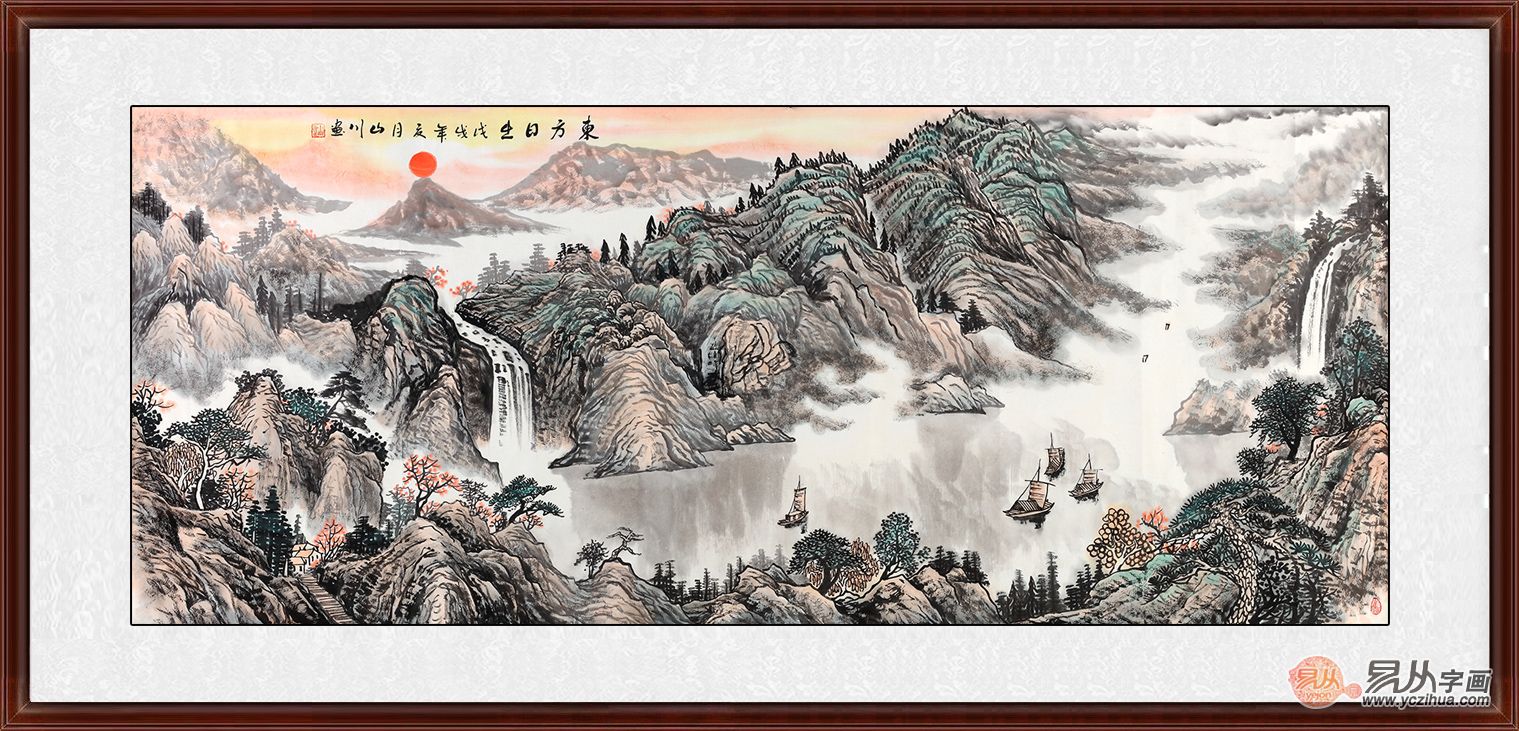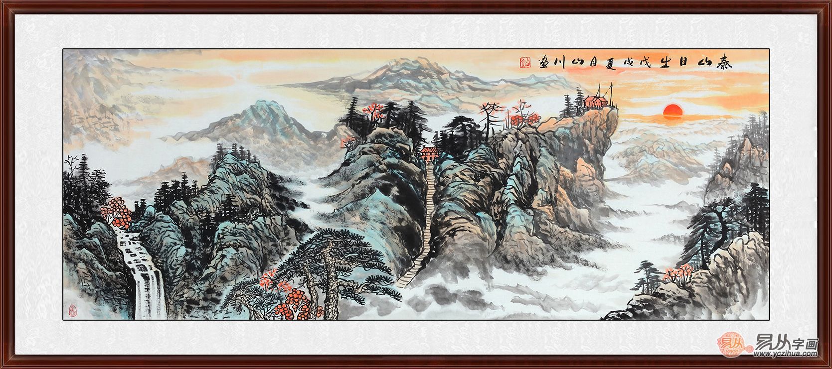 气壮山河画家山川手绘国画作品《东方日出》作品来源:易从网太阳从东方升起,山色泛青,一幅清晨山水画。清晨是一天的希望,太阳周围尽是红晕,祥云笼罩着周围,寓意福泽和吉祥。山势巍峨,群山连绵,寓意基业稳固,人脉宽广,这些山更围成一个聚宝盆,山上的水源源流下汇入聚宝盆,寓意财源不断,财源广进。远处水势汹涌,近处水平如镜,形成了鲜明的对比,这样一幅有气势的山水画挂在会议室,可以提升会议室的档次和气势。会议室挂山水画推荐四:泰山日出,基业稳固
