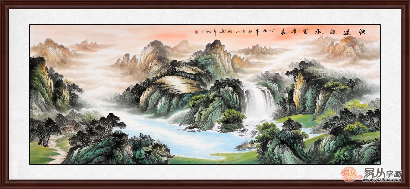 流水生财福泽长玉简八尺聚宝盆作品《源远流长富贵长》作品来源:易从网画上峰峦叠嶂、气势雄伟,深谷云林处隐藏茅屋,树木丛生百草丰茂,景色宜人好一幅融融生活图。语言运用、物象描绘、风格追求等方面继承了传统山水的高古、清幽、旷远,逐渐形成自身风格,笔力峭拔、墨色湿润、层峦叠嶂、丘壑深邃,格调苍劲秀雅,布局含蓄严谨,带着淡淡的禅意诗情,使古典的青绿山水画面貌为之一新,具有时代的审美特征,可居、可游、可赏,意趣盎然。构图以“高远”和“平远”二法结合,而其深远、奥妙、飘逸尽得其当。画法是皴染兼有,皴法用小披麻皴,层次井然。树木有枝无干,用笔简劲老辣,有粗细断续之分,笔到意到心到,情境交融。从风水上讲,此幅作品是聚宝盆构图,挂于会议室有着聚财旺运的效果,国画山水画,一个画尊的选择。会议室挂山水画推荐二:聚财旺运,基业长青
