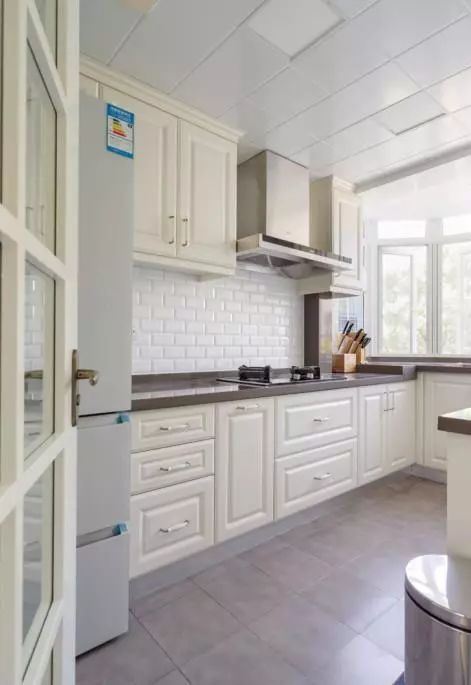 厨房空间挺大的,都做满了橱柜,做到顶的设计,使得空间一点也不浪费。