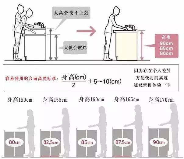 一般家庭的厨房台面高度在80—90cm之间,然鹅,姚明和潘长江能用同一个高度的台面的吗?每个人都长得不一样高啊!有个简单的计算公式:身高÷2+5~10cm,这是最舒适的台面高度,记得用最常使用厨房的人的身高去计算哦~