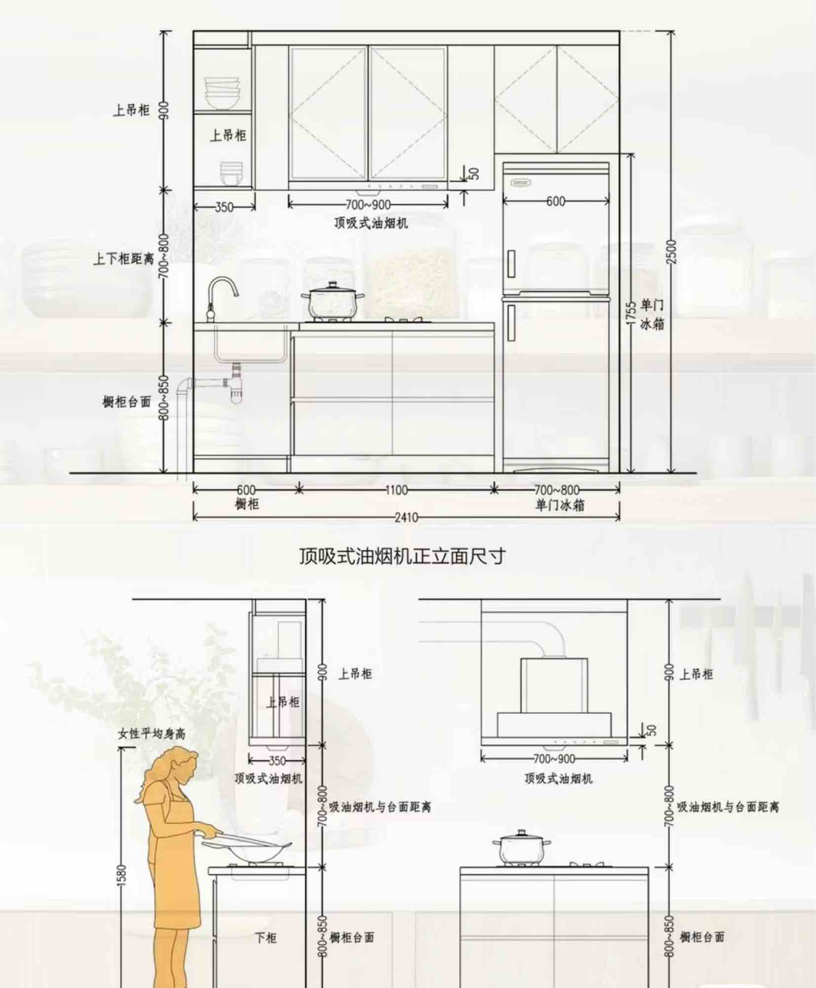 三、高度地柜吊柜的高度和掌勺人身高有关,地柜高度计算公式是身高除以二再加五厘米,在地柜高度的基础上加60厘米就是吊柜的高度。