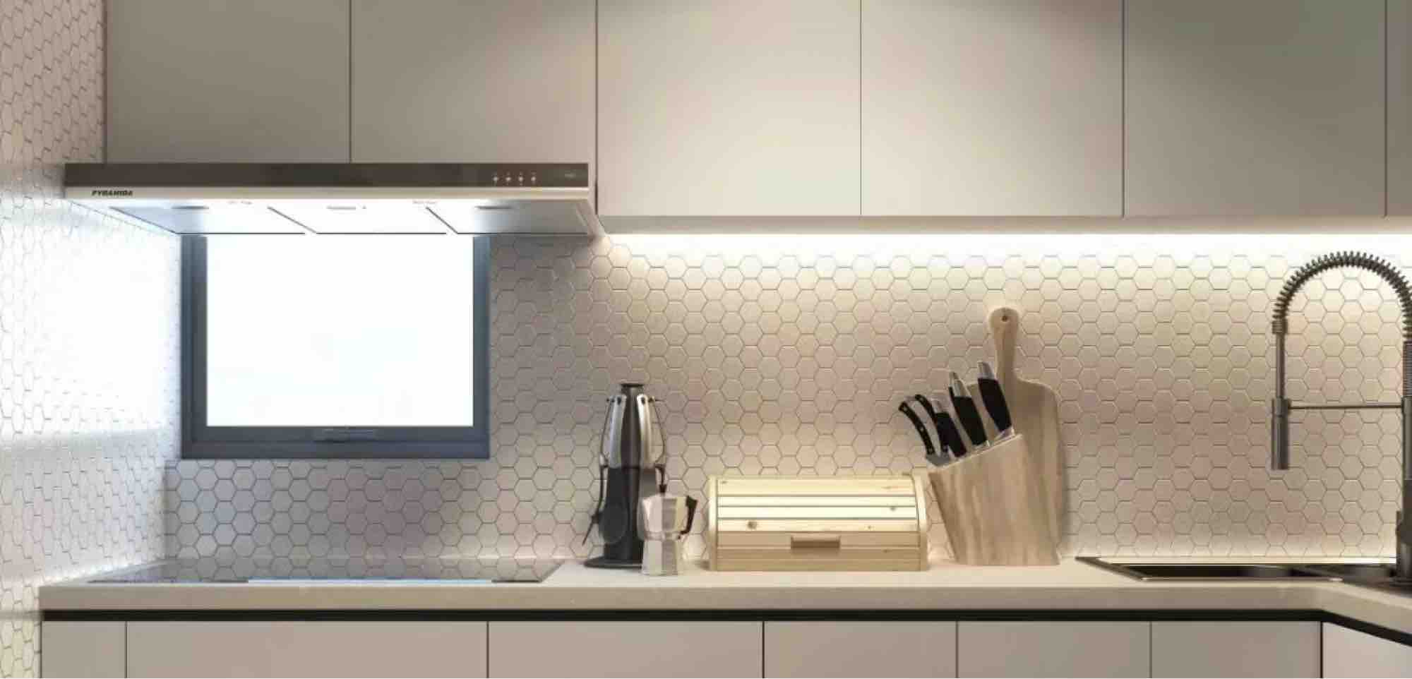 六、吊柜底下的灯,人在厨房操作的时候会把顶灯光线遮挡住,在吊柜下方加一条灯带,切菜不容易伤手,做饭心情更好。