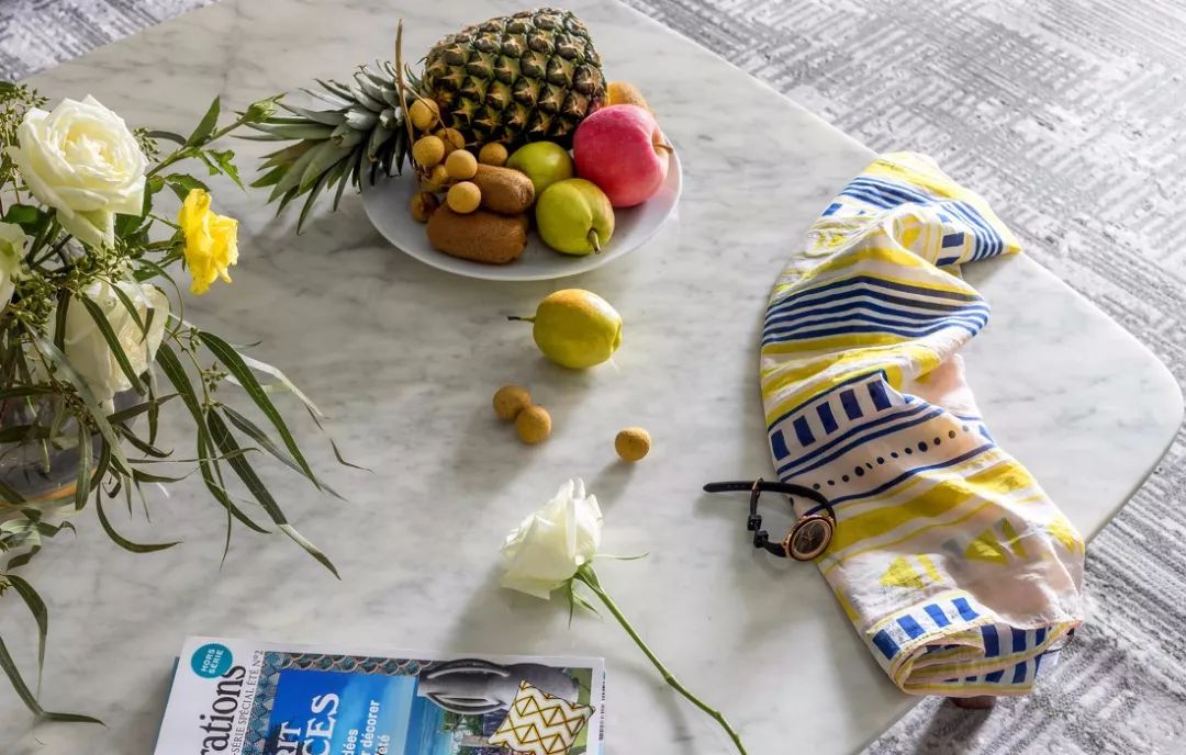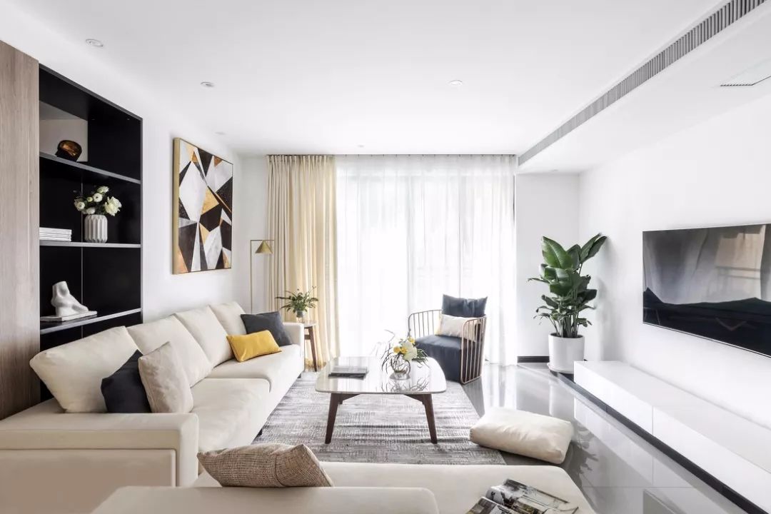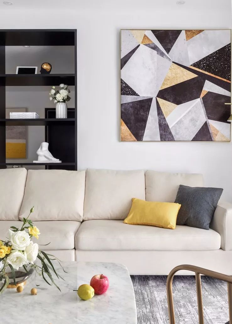 ▲整体色调偏素雅,以黑白为基础色调,辅以布艺大面积柔和的象牙色,穿插着黄铜加大理石的材质,点缀少量黄色。