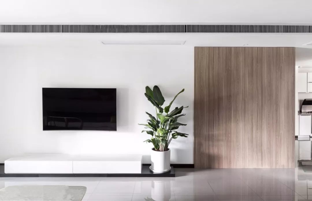 ▲侧视板延长,作为电视墙的色彩和材质补充也是恰到好处,一株茂盛的鹤望兰,增加了一抹柔和的过度,充满生机。