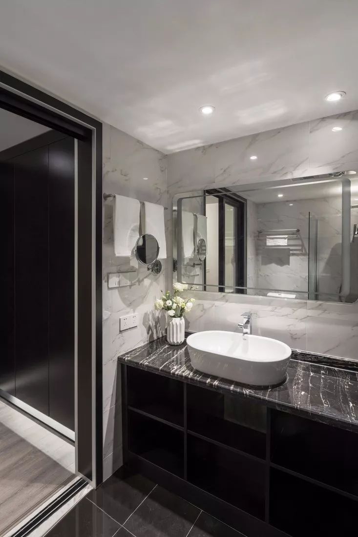 ▲卫生间,布局上以开敞式设计为轴心,赋予视觉延伸感和张力。黑白色为主基调辅以少量亮色,时尚简约。