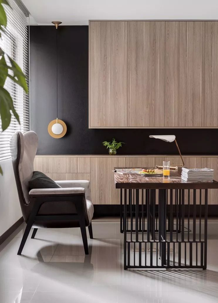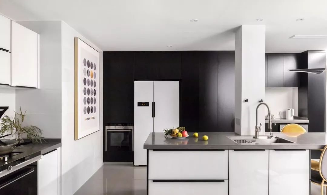 ▲设计师缩短了原始户型过长的餐厨距离,一个空间既可进行调理烹饪装盘又可进餐,整个一面墙的巨大落地窗保证了充足的采光。