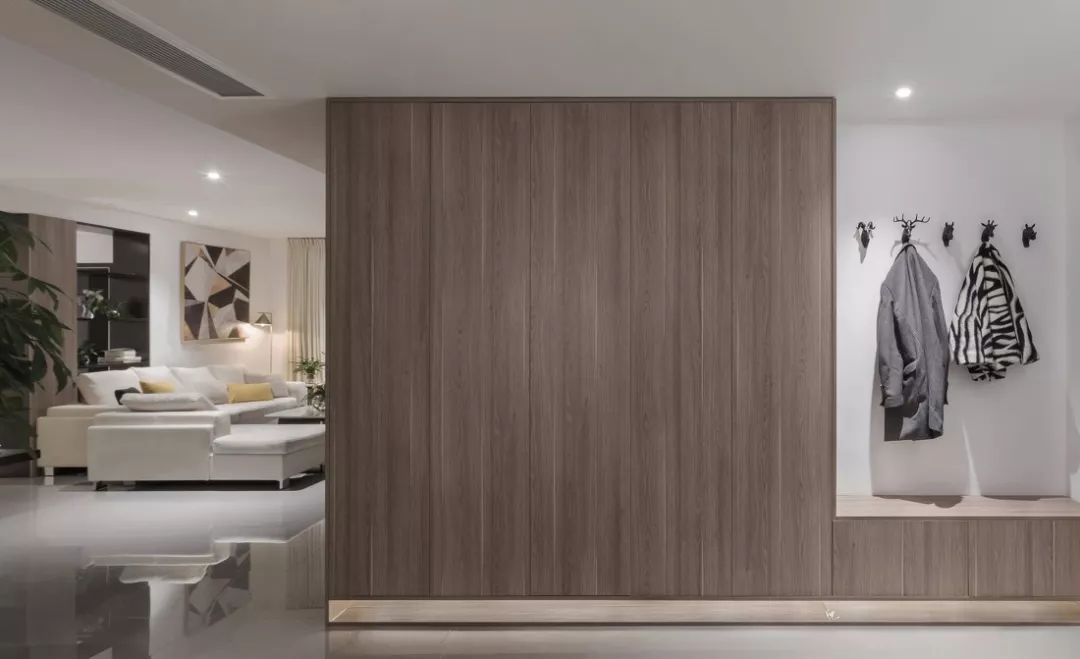 ▲玄关鞋柜取出部分空间作为换鞋区域,精巧的动物挂钩用来挂放外套和雨伞等物品。