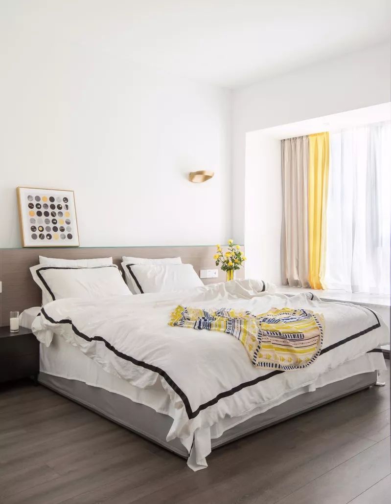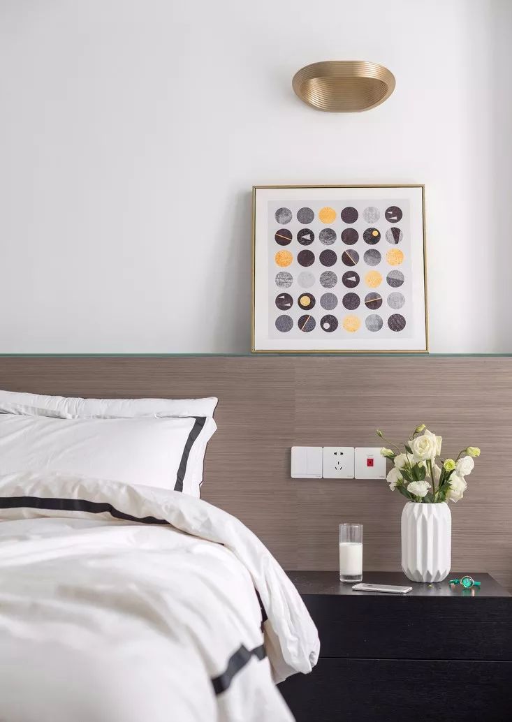 ▲主卧的床头是现场木工做的,定制了无靠背床,平面可以用来放置小件的花器水杯和手机等物。