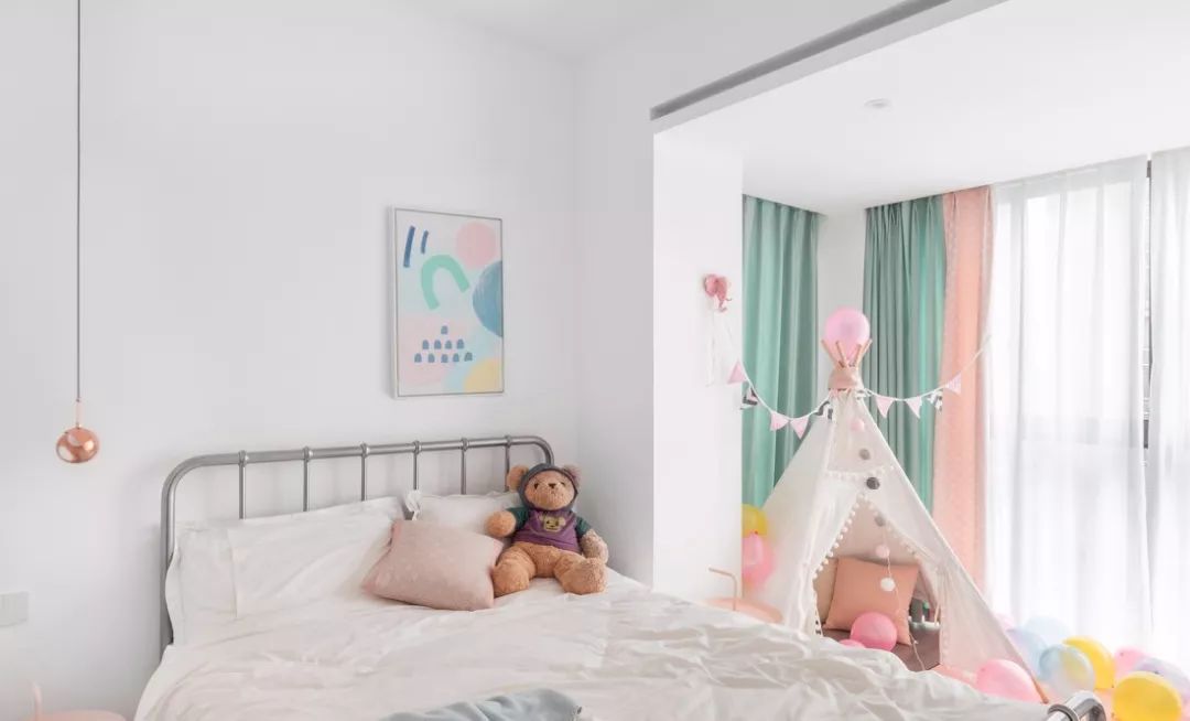 ▲儿童房,整体色调糅合了蒂芙尼蓝+淡山茱萸粉+一丢丢的婴儿蓝+一丢丢的明黄色,但基础色仍以白色为主,明亮轻快。