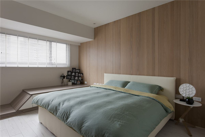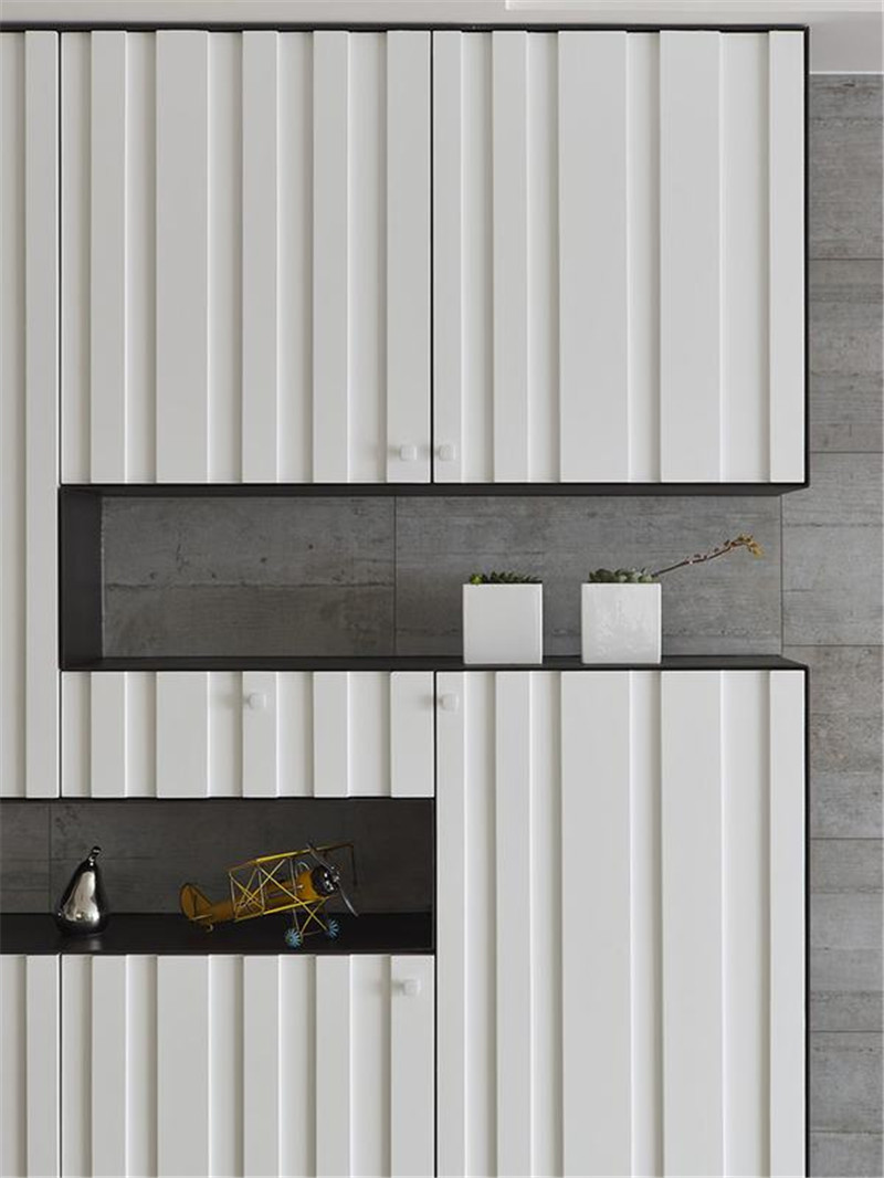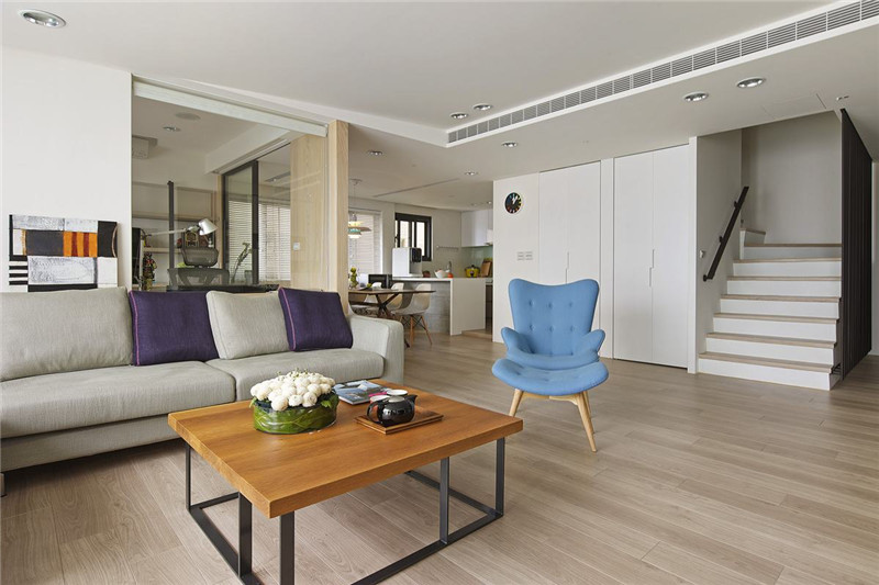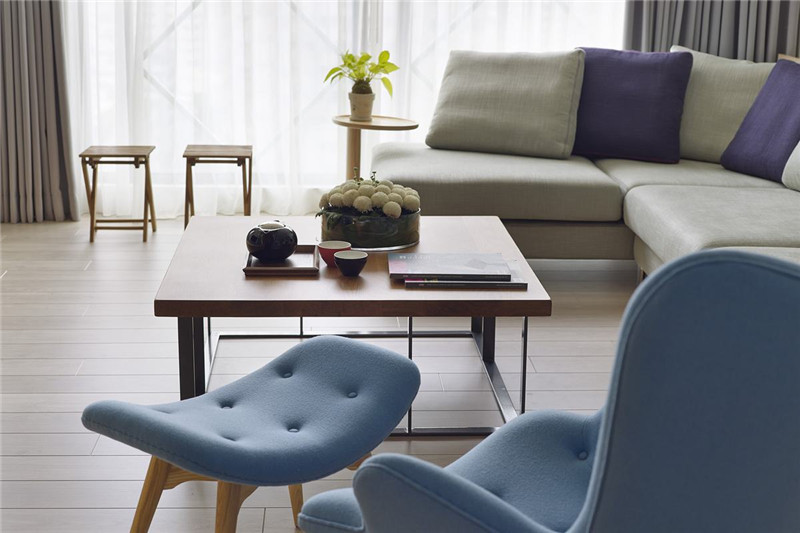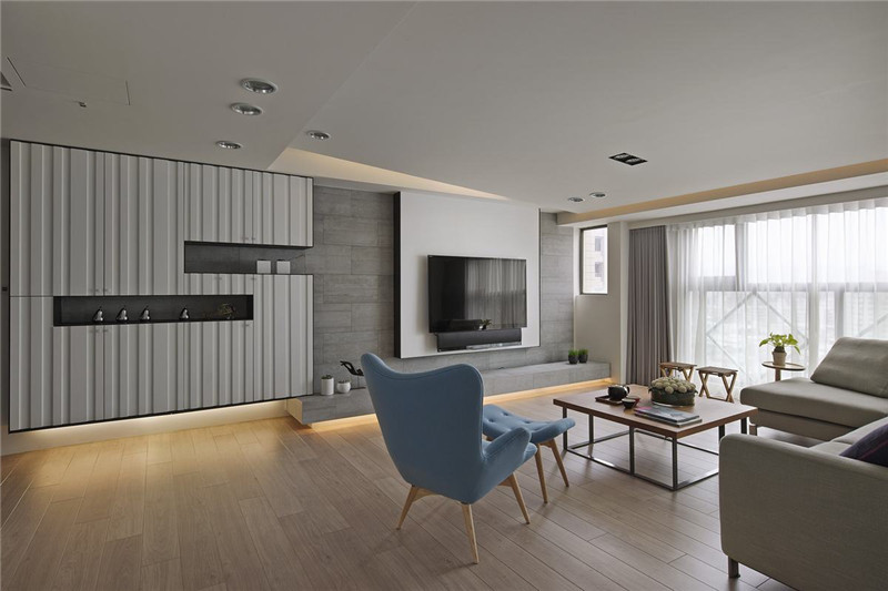 by 台湾丰聚设计 北欧风,但并不刻意小清新,进门处左手的墙面柜的处理非常花心思,材质和造型给客厅空间增加了浓浓的设计感。低饱和度的蓝和绿,安静舒适。