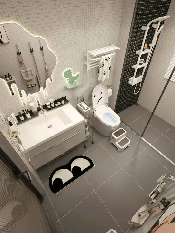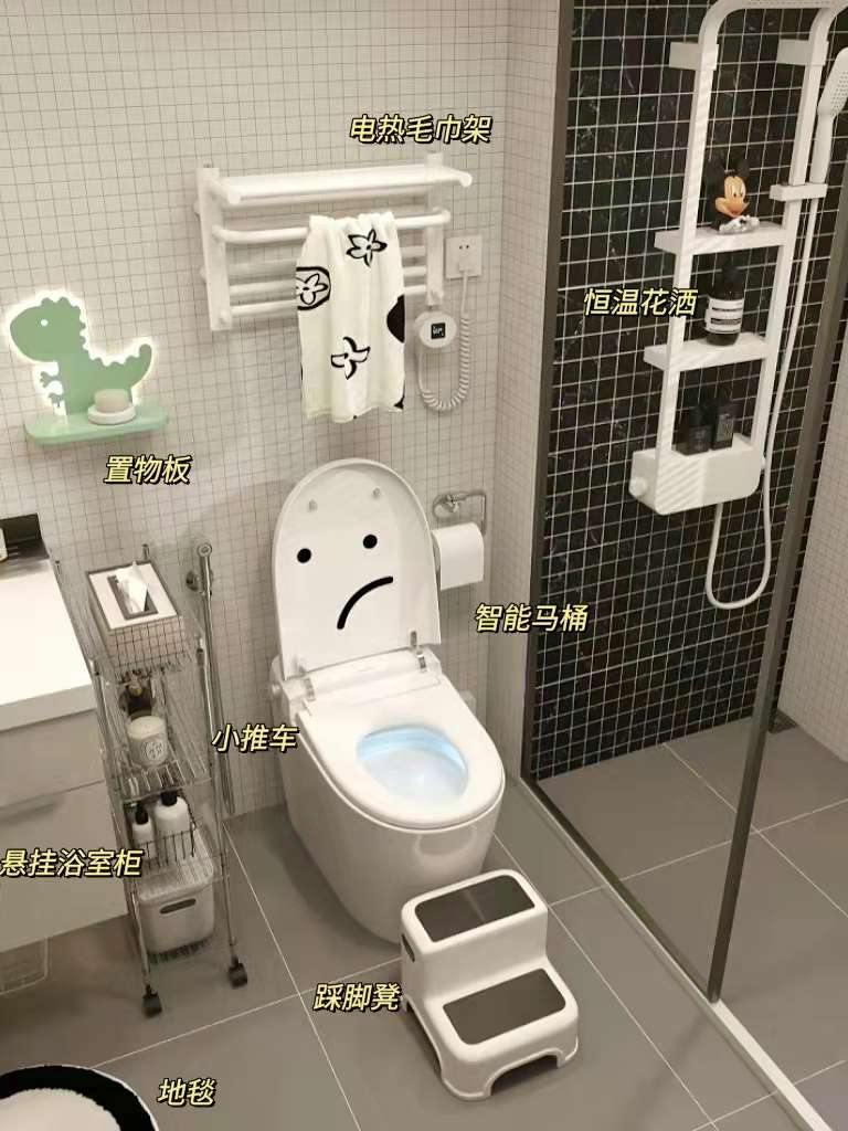 每一个认真生活的人都会把家里装扮的漂漂亮亮,厕所也不例外哈哈哈✨卫生间选择了一体式全自动智能马桶,周边配备了垃圾桶踩脚凳以及置物小推车,就很nice,马桶是内置水箱,所以不用担心冲水问题,可以放心大胆用‼️