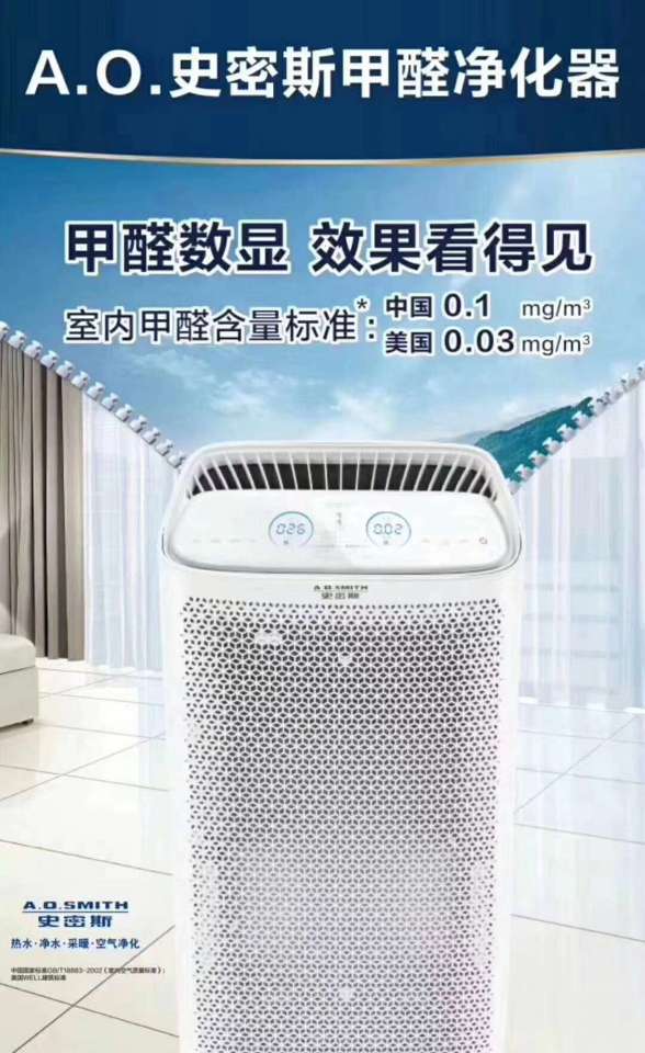 [强]颠覆整个空气净化器行业的一款产品。搭配甲醛数字显示专利技术(超强抗干扰、误差低于2%,精准显示)、深度滤除甲醛技术(湿度30%左右0.2微克每立方米的甲醛浓度可降至美国标准0.03毫克每立方米)?A.O.史密斯甲醛净化器,净化效果看得见。