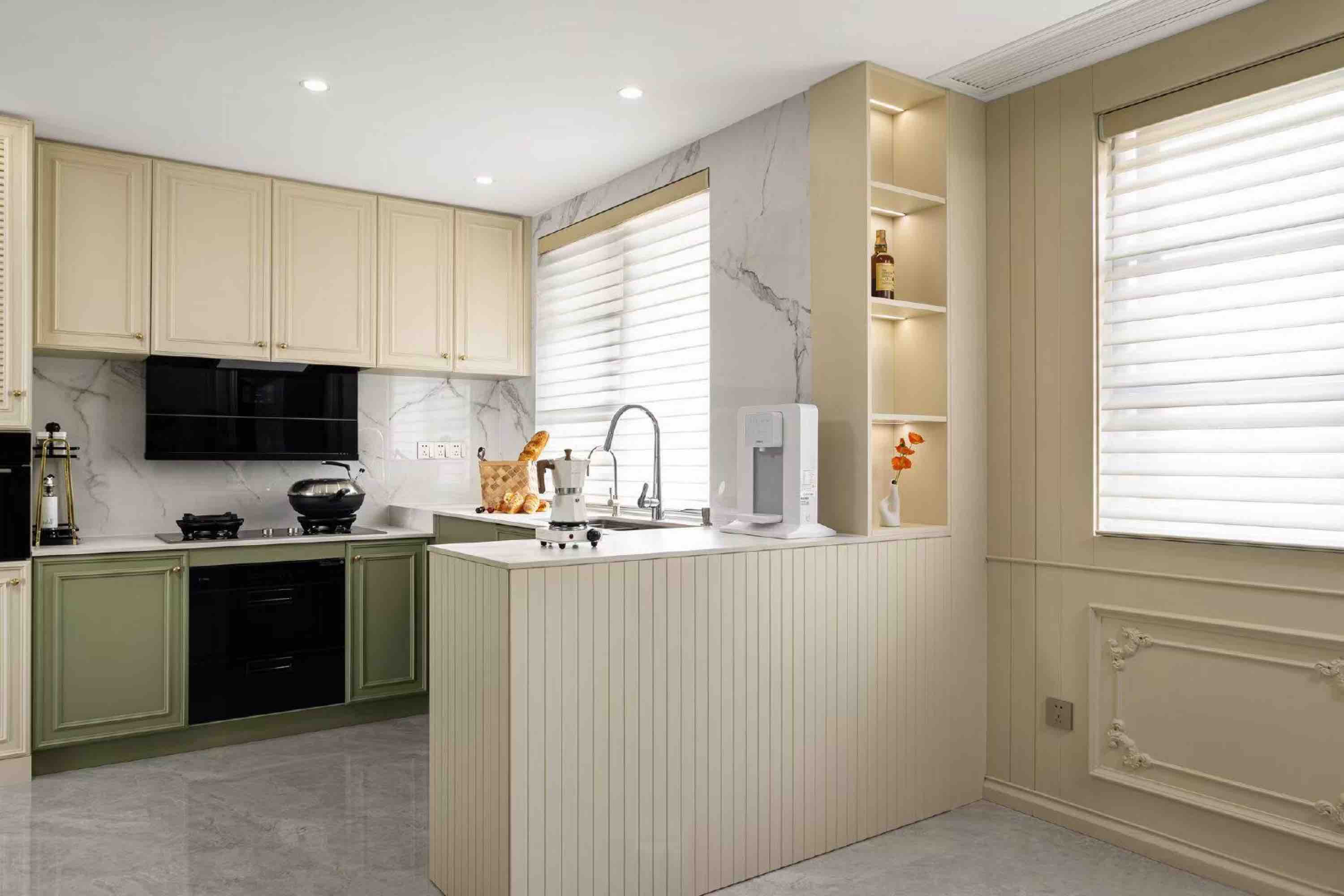 U型布局进一步扩大收纳,还可以利用U型的一边做吧台,增加收纳的同时也能进一步扩大收纳空间。