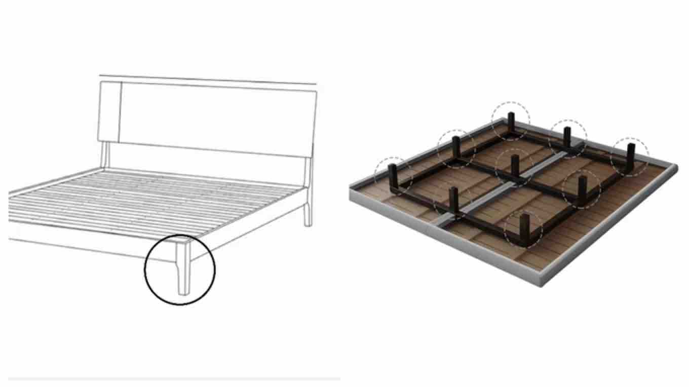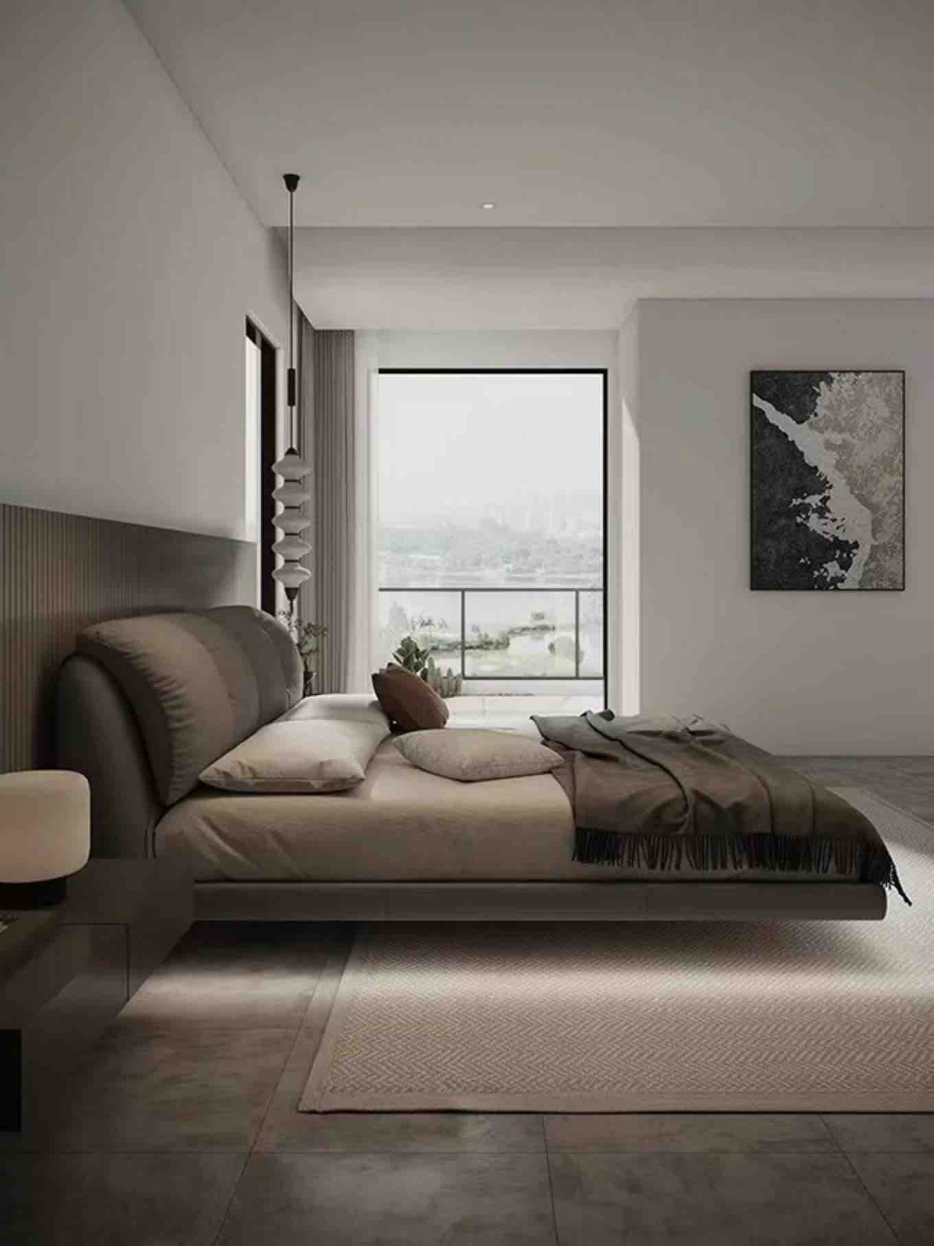 如下图,常规大床的床腿与床沿齐平,而悬浮床的床腿在床底内部,内收进去了,看不见腿就好像真的悬浮在空中一般。