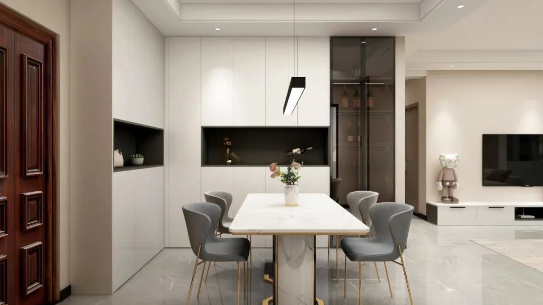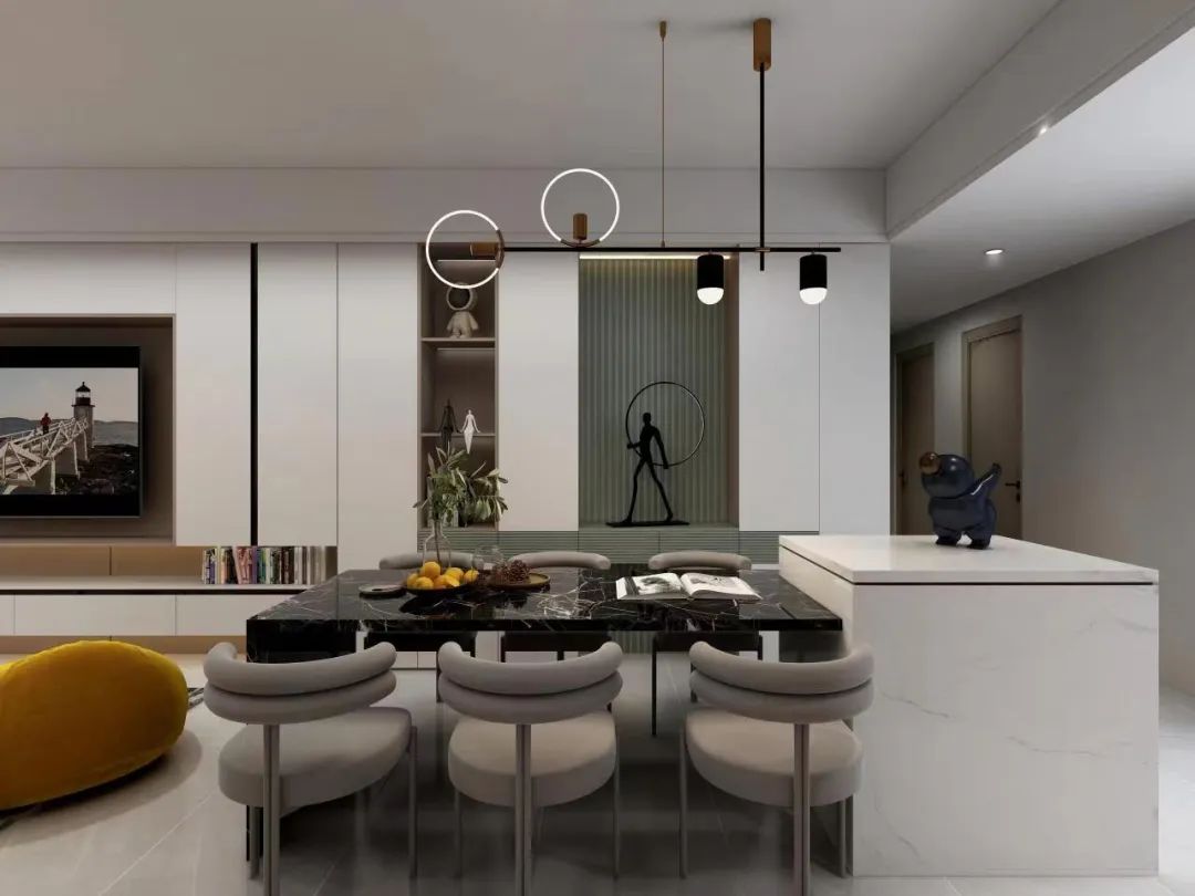 如果觉得客餐厅没有隔断,空间区域划分不明显的话,还可以在电视柜与餐边柜中间设计整列开放格或其它方式作为视觉观感上的区隔。