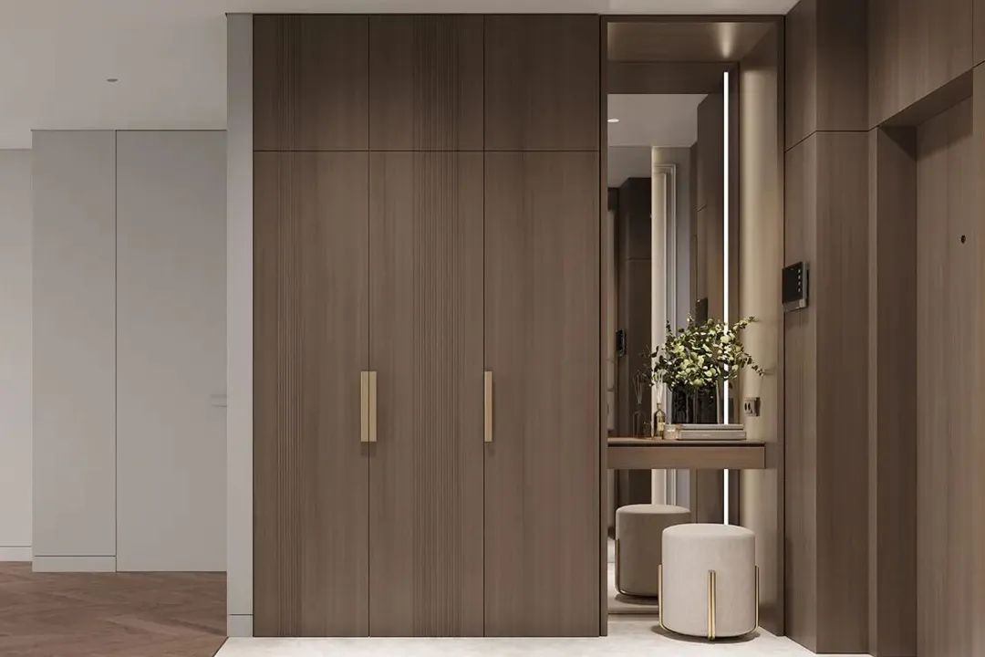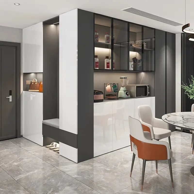 玄关柜餐边柜入户和餐厅连在一起的户型可以试试在入户处打造“L型”入户餐边一体柜,以转角区分二者功能,在不浪费每一平米墙面的同时,风格又和谐统一,避免了柜体配色困扰。如果餐厅空间比较小的话,还可以在这里贴墙定制卡座来代替餐椅,不仅节约了椅子的占位,卡座还能用来储物,进一步提高了空间利用率。