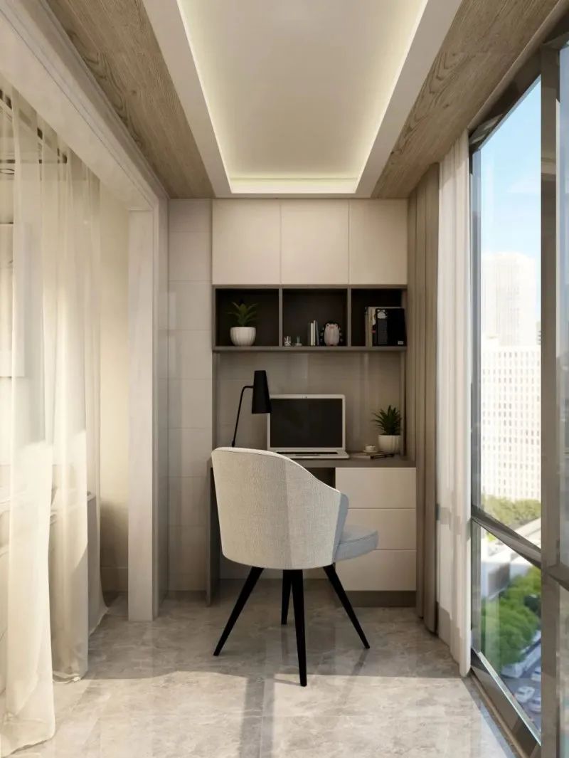 阳台柜工作台阳台柜设计得好,可以为阳台增色不少。阳台上部分做到顶半开放式吊柜,用来收纳和展示。下方做书桌台面,就能成为一个独立的办公区。阳台视野宽阔,工作闲暇举目远眺,还可放松身心。当然你还可以做嵌入式满墙多功能柜,可以是书柜,也可以是衣柜,日常收纳游刃有余。