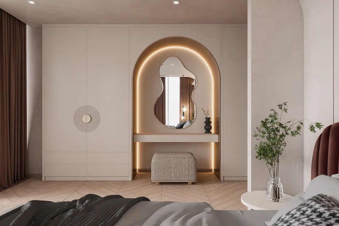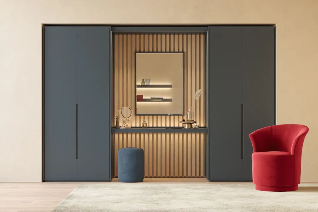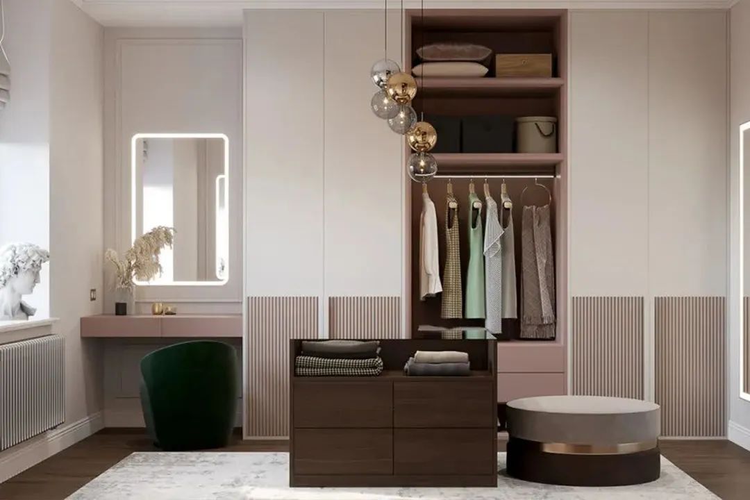当然,除了延展出来,也可以直接把梳妆台“装”在衣柜里,做衣柜时提前设计好在某一处空出一个空间,定制一个置物格,安装抽屉,充当梳妆台面,不仅整体性强,也更节省空间。