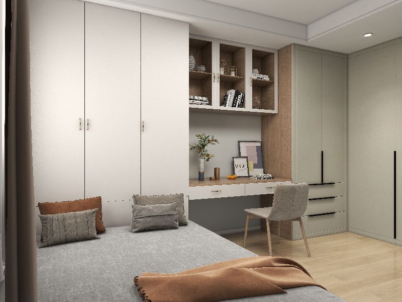 卧室中设计了榻榻米床、吊柜式衣柜以及木制梳妆台等家具,装修效果简约实用而又舒适时尚。