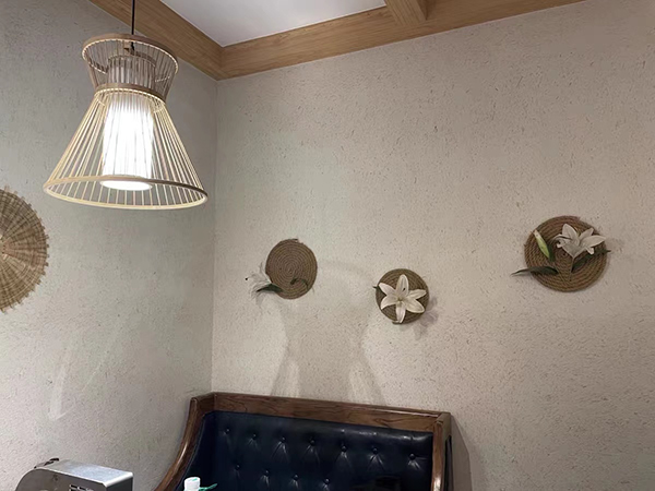 内墙稻草漆,又称艺术稻草漆,是最原始、最简单、最温暖宜人的建筑材料,引进国内加工技术,利用稻杆、微空粉末、石英粉等天然材料制作的内墙稻草漆,让您始终具有自然的地方氛围,转向安静简单的生活环境,内墙稻草漆选用的生产材料为稻杆、蛭石粉、微空粉末、石英粉等天然材料,不用担心甲醛、VOC排放等问题,无论是生产过程、施工过程还是成品,都是对人体无害的健康产品,所以在健康方面,稻草漆领先于一些油漆等材料。稻草漆内外墙都是通用的,一般用于购物中心、酒店、餐厅、服装店、茶馆、咖啡馆、主题餐厅、别墅等,工艺一般相对精致,颜色相对柔和,主要呈现自然、简单、优雅,能带来回忆甜蜜、回归自然的感觉。稻草漆选择做外墙一般选择颗粒较大的材料,效果更三维、粗糙,视觉效果非常自然,通常在景区、民宿、新农村改造等,如果你想特别,你可以用稻草漆做拉毛效果或弹涂效果,这些是稻草漆常用的外墙效果,看内墙稻草漆效果图: