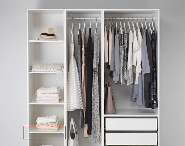 床品的更换频率不如衣服那么高,并且十分占空间。尽管十分不喜欢搁板把空间做了分割,也要给被子、枕头、毯子等留出单独的空间,一般选择在最上部、或者最下部。