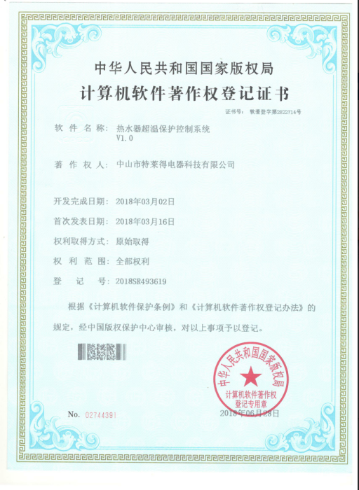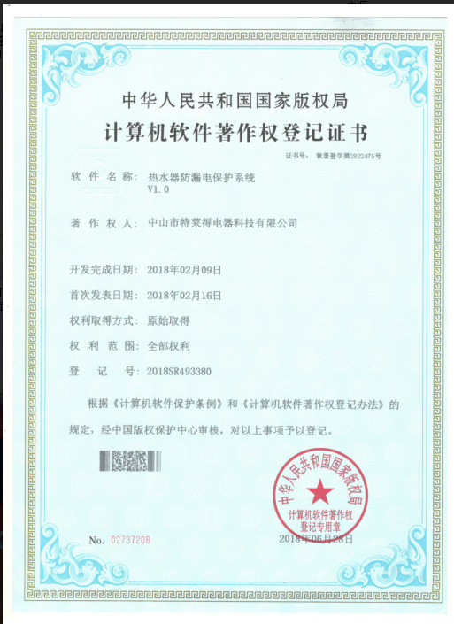 由特莱得电器研发的六项软件系统:热水器超温保护控制系统、热水器防干烧保护电源控制系统、热水器变频加热控制系统、热水器智能恒温控制系统、热水器防漏电保护系统、热水器功率选择可调系统,荣获国家版权局颁发的使用证书,这不仅促进了特莱得热水器产品的安全性能,更是推动了电热水器行业信息安全平台向着更加安全化、规范化、标准化方向发展。