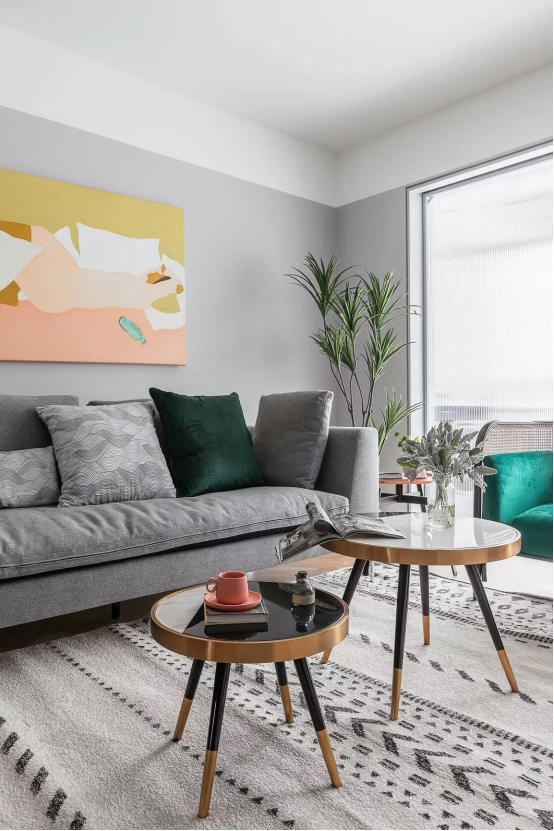 米色短绒几何图案地毯清爽整洁,且不易藏污垢和灰尘。皮质坐凳、黑白撞色金属框茶几、青葱的绿植、抽象的装饰画,每一个细节都饱含对生活的热情和对艺术的欣赏。