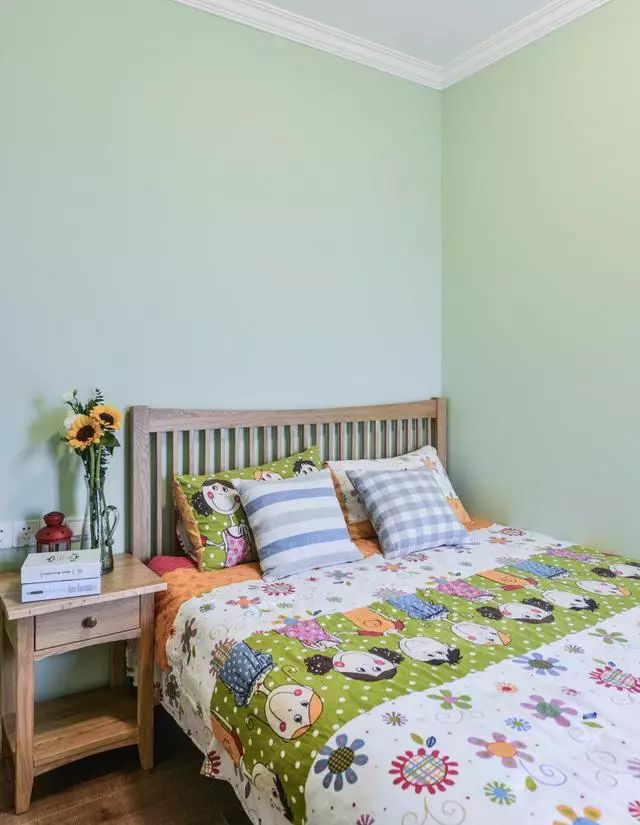 次卧是给母上大人准备的,原谅我没钱了,没有重新买四件套,将就用的以前的自己的卡哇伊。想母亲大人的房间多一些朝气,所以选了绿色的墙漆,结果这个颜色却是最失败的,有点刺眼。
