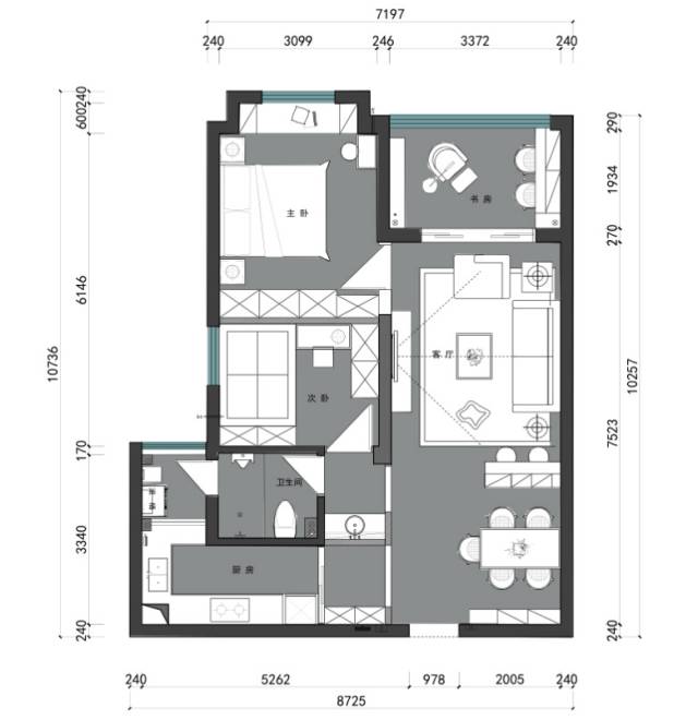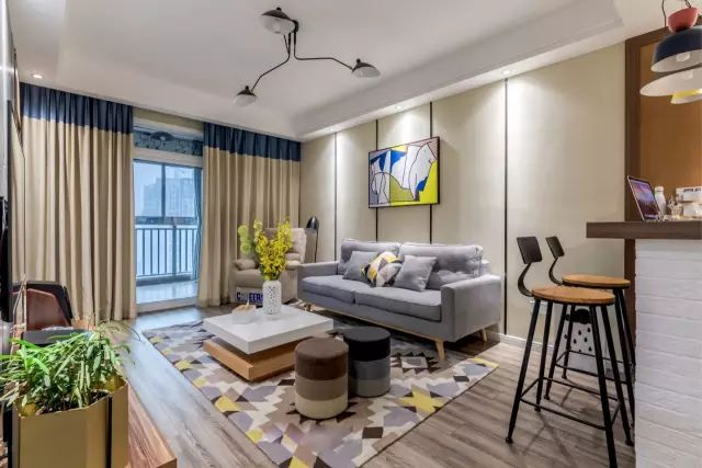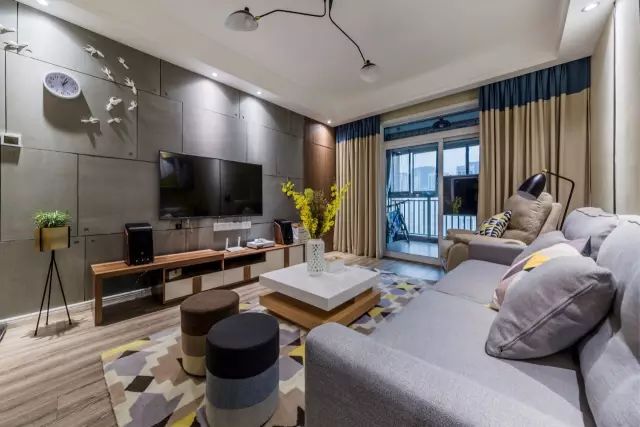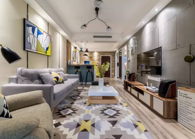 客厅装修是用现在流行的几何图案做装饰,地毯和抱枕与几何图案颜色一致,非常具有现代时尚感。