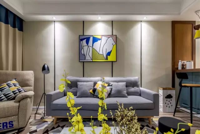 沙发背景中明亮的黄色在现代室内装饰中也是一种常用色彩,做为点缀,提亮整体色调,更具活力。