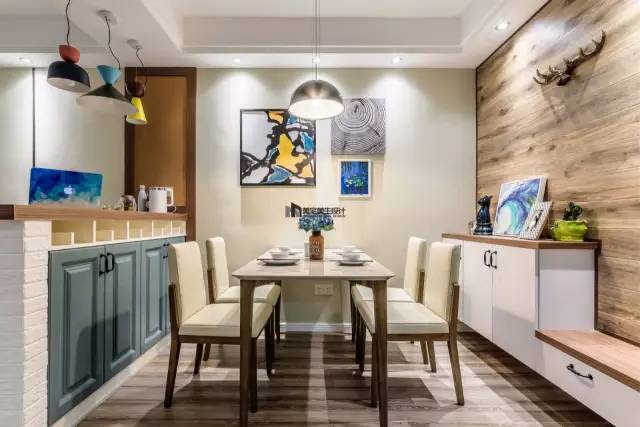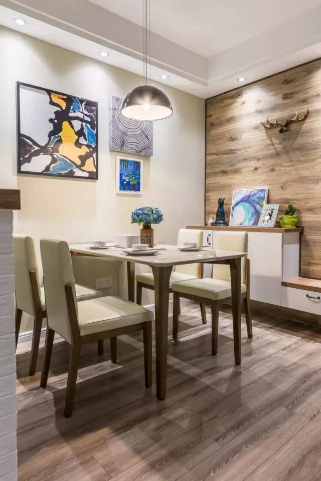 餐厅中的另一面墙是采用的地板上墙作天然的装饰,显得餐厅自然古朴有韵味。