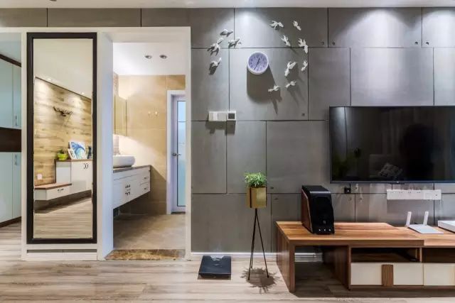 125平简约风格装修的卫生间设计,为尽可能的避免空间的单调与乏味,加放全身镜,视觉上放大客厅空间。