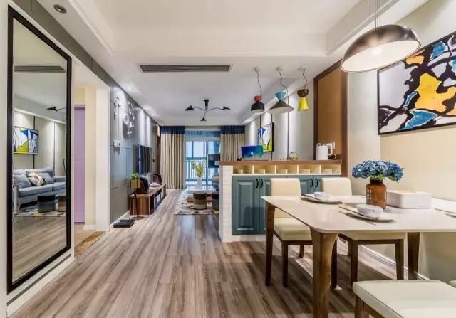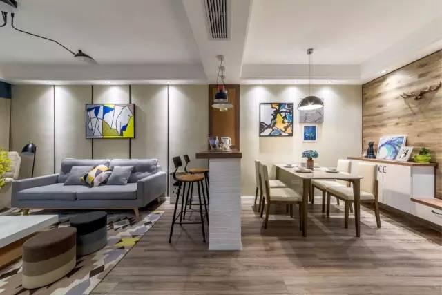 在这幅客餐厅同一空间的角度里,小吧台显得别具情趣,将餐厅与客厅分隔开的设计很有创意,同时实用性也很高。