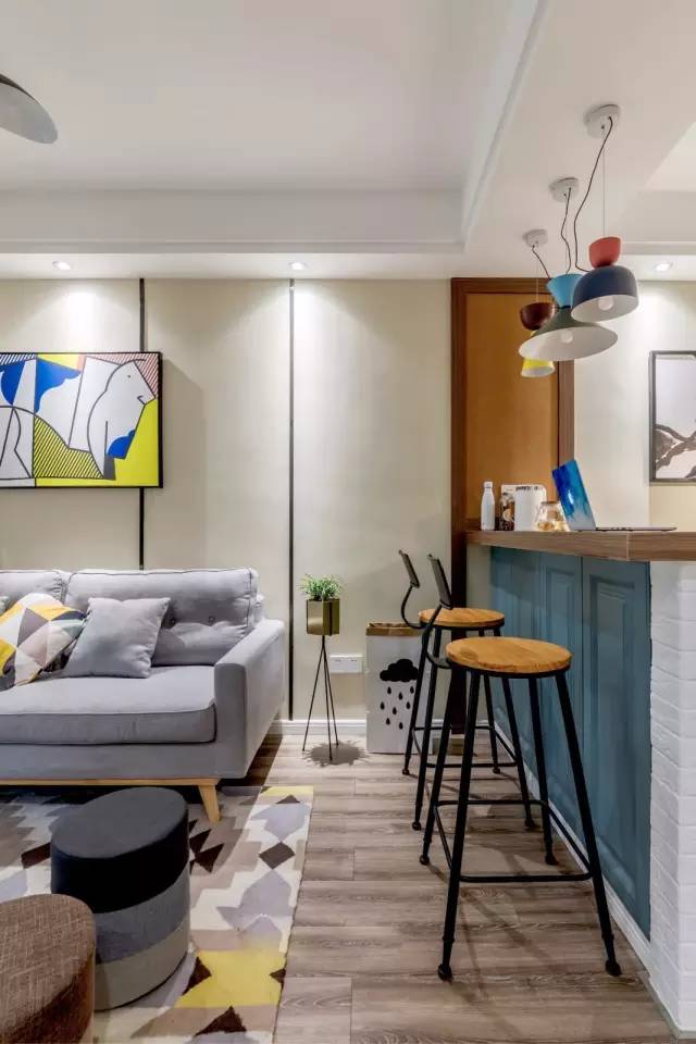 小吧台选用文化石、清新蓝色及木台面,搭配高脚凳和彩色灯具,清新文化范十足。