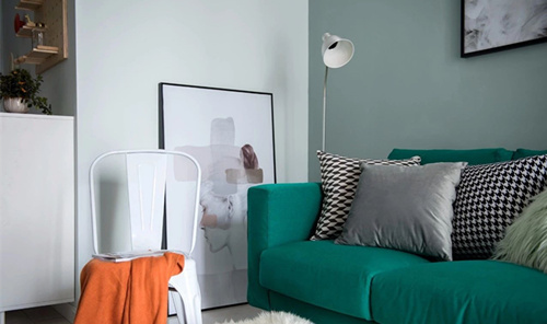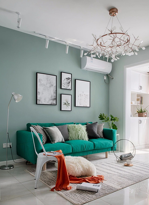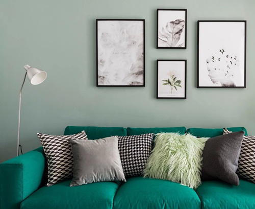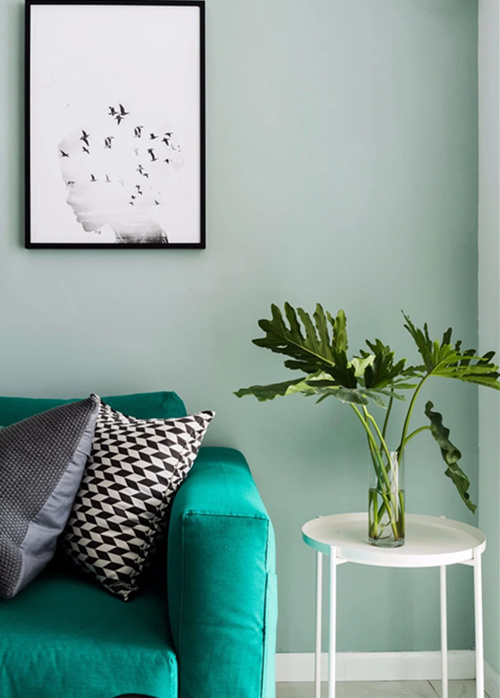 4 、 宜家款湖绿色沙发搭配浅绿色背景,抱枕,装饰画与绿植点缀出清新时尚感