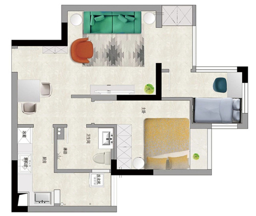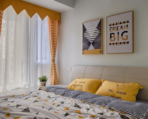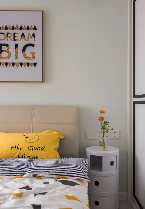 11 、主卧清浅基调中加入跳跃的一抹黄色,让小空间充满活力氛围