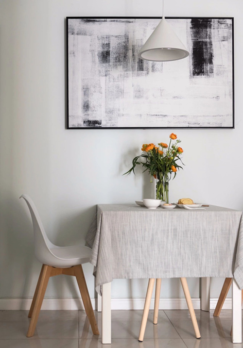 8 、 餐厅采用小尺寸餐桌,点缀大尺寸装饰画,一盏简约吊灯与橙色芍药,营造就餐氛围