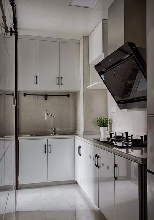 9 、L型厨房结合洗衣区,延伸使用空间,白色橱柜搭配卡其色台面,简洁易打理