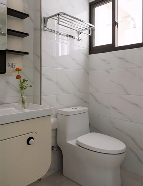 3 、 客厅地面通铺浅色石纹瓷砖,极简顶面装独活树吊灯与轨道灯作照明