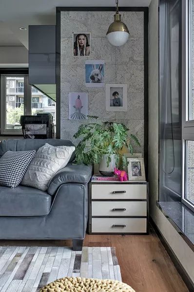 沙发与阳台角落位置的墙面贴上水泥质感的砖,挂上几幅装饰画,自然狂野而又大方;