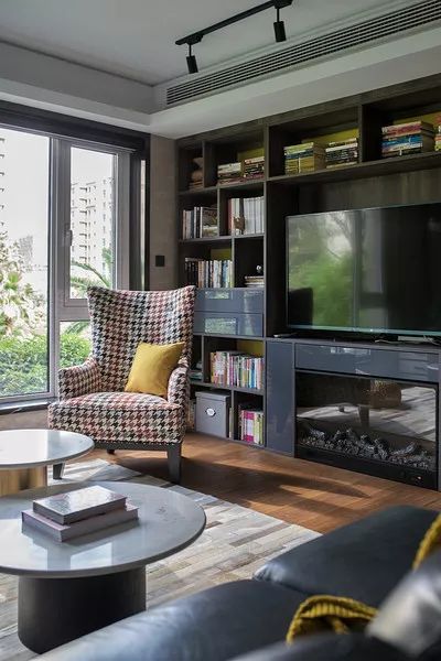 电视墙装成一整面的大书柜,让电视墙不仅是摆设,还是实用的储物空间;坐在休闲沙发椅上,看书阅读,好不惬意;