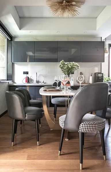 餐厅以时尚端庄的皮质餐椅,餐桌以金属脚架+大理石台面的搭配,时尚而高档端庄;