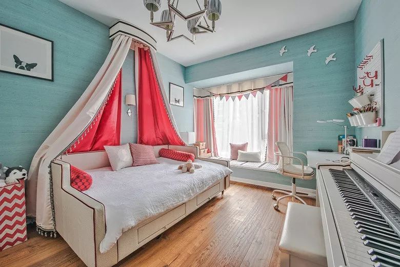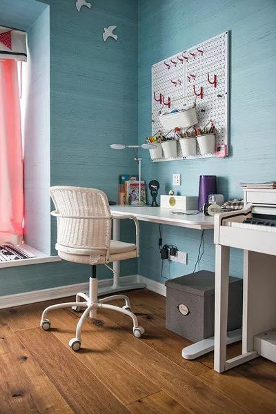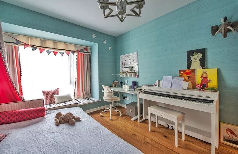 儿童房把书桌、钢琴与床平行摆放,中间腾出宽敞的过道空间,在蓝色调的自由洒脱下,呈现出舒适自然的空间感;