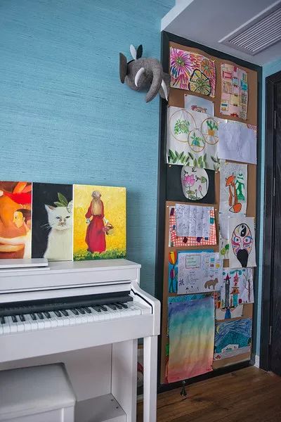 在儿童房门口旁边的这面墙上,贴满了孩子的作品,记载着她的成长记录;
