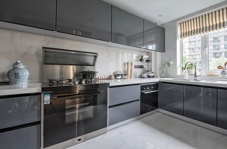 厨房采用集成灶的设计,顶部的吊柜装了一整排,提供了丰富实用的收纳空间;而独特的灰色橱柜面板,也让这个时尚显得更加现代大方;