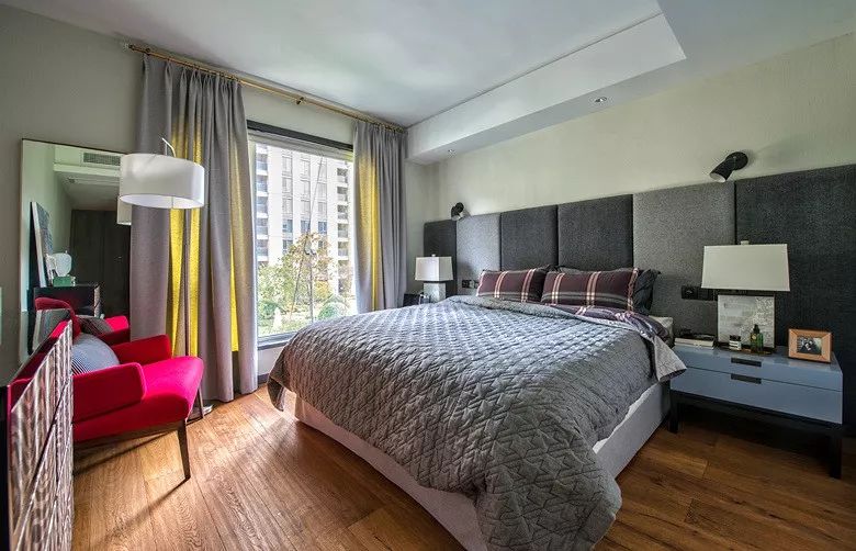 床尾一张红色的单人沙发,结合斑纹的斗柜,让空间显得更加个性时尚;