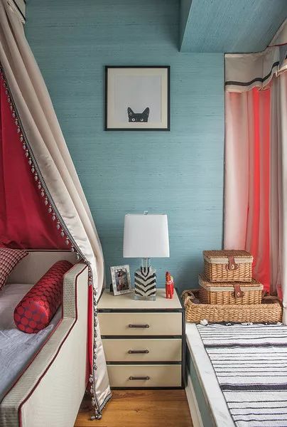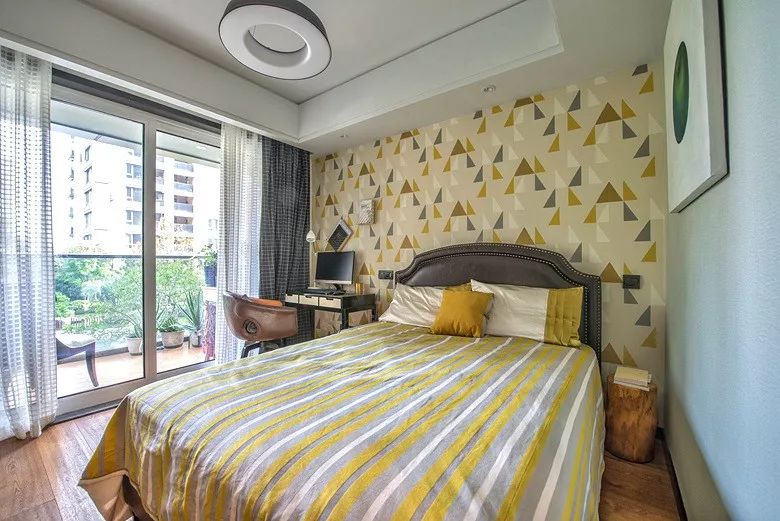 次卧的床头贴上个性的三角形图案的墙布,结合鲜艳的床单,让这个空间充满了活力精致的气息,给人以活泼的氛围感;